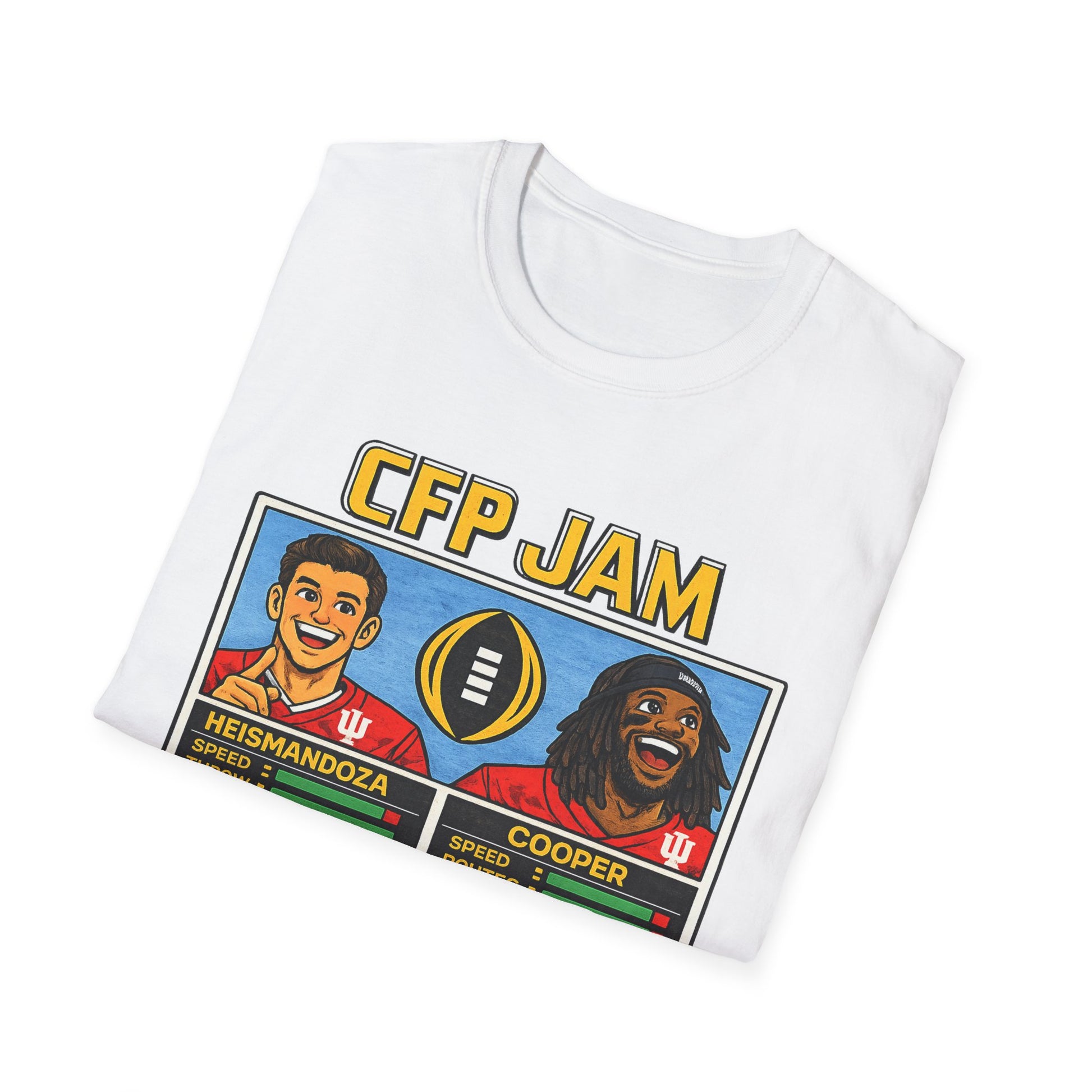 Celebrate legendary Hoosier football with this retro-inspired tee featuring Heismandoza, one of college football's most iconic characters. Rendered in classic video game styling reminiscent of 8-bit arcade aesthetics, this design captures the golden era of gridiron glory. Perfect for fans who appreciate nostalgic gaming culture and college football heritage, this adult tee blends two beloved worlds into a single wearable tribute. Whether you're a longtime supporter or discovering the lore of CFP JAM, this piece delivers authentic retro charm with genuine fandom appeal.