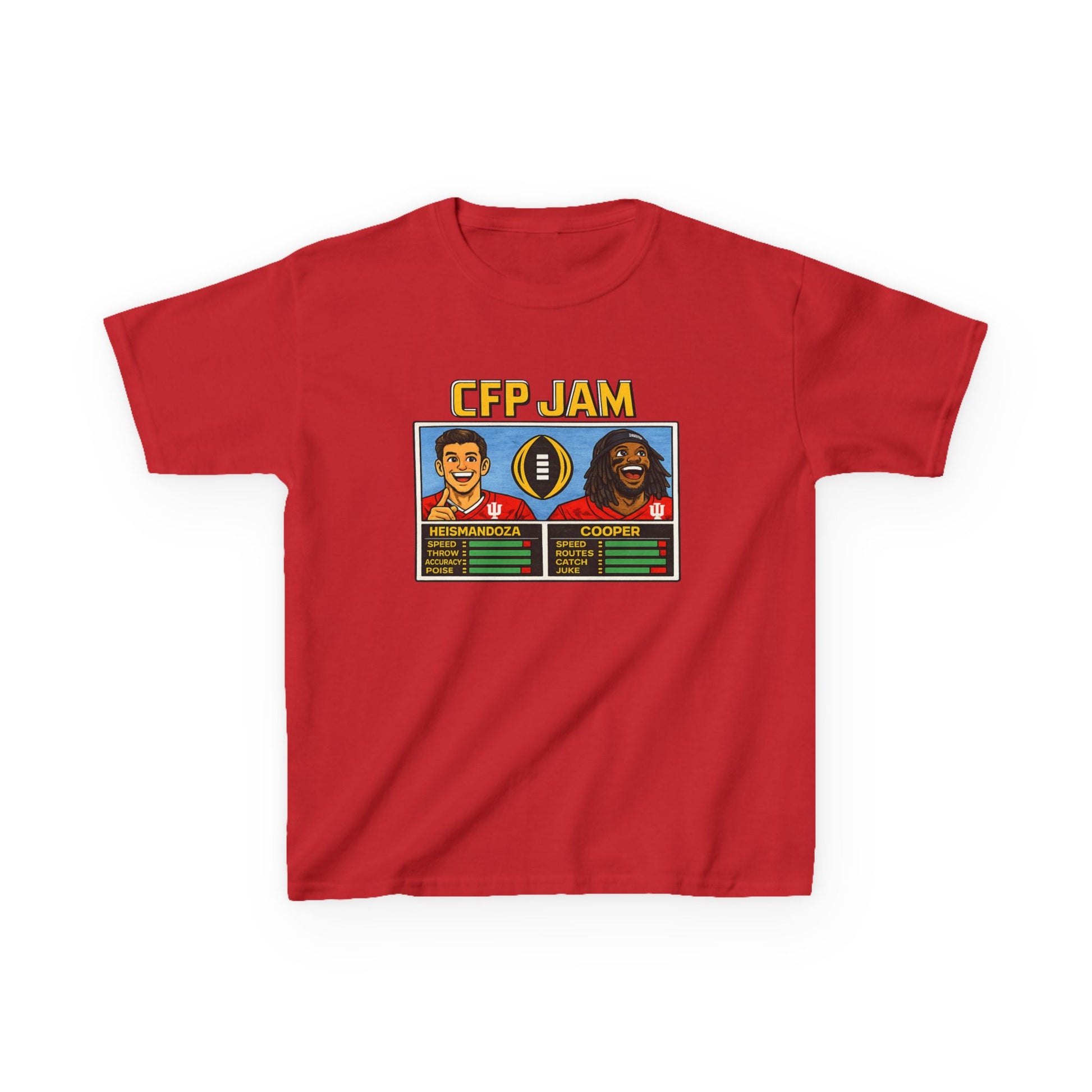 Celebrate Indiana football's dynamic duo with this retro-inspired CFP JAM Tee. Featuring Heismandoza and "Toe Tap" Cooper in classic 8-bit video game aesthetics, this tee blends nostalgia with modern fandom. The pixelated design captures the golden age of arcade gaming while honoring two of IU's most electrifying players. Perfect for fans who appreciate throwback style and gridiron greatness.